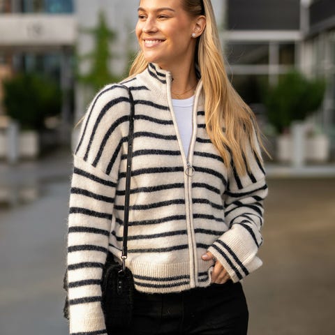 Design-cardigan i mørkegrønne og svarte farger. Pent og lite brukt, selges med tungt hjerte da den har blitt for liten for meg.