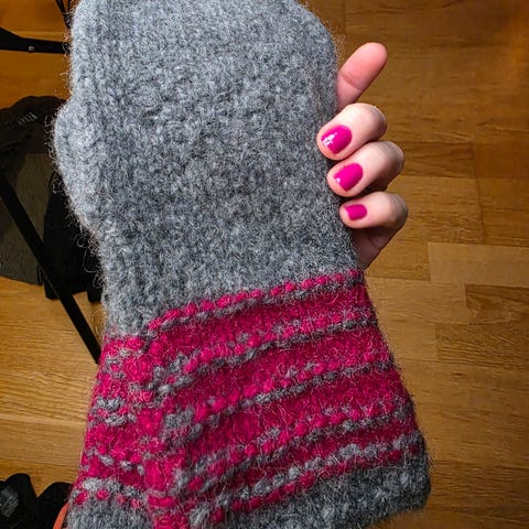 Strikket med fritidsgarn fra Sandnes Garn og tovet i vaskemaskin på 40 grader.