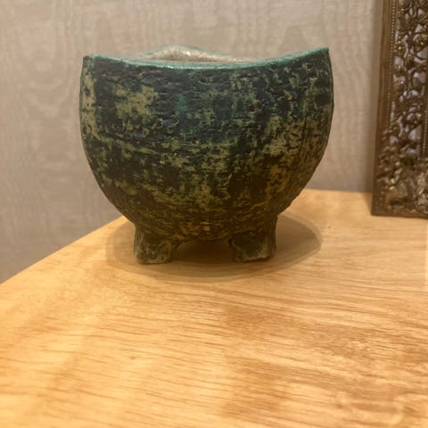 Skålen er ca 5 cm høy. Diameter åpning er ca 7 cm. Den selges for kr. 100. Porto for sending med Post nord inkl sporing er kr. 69.