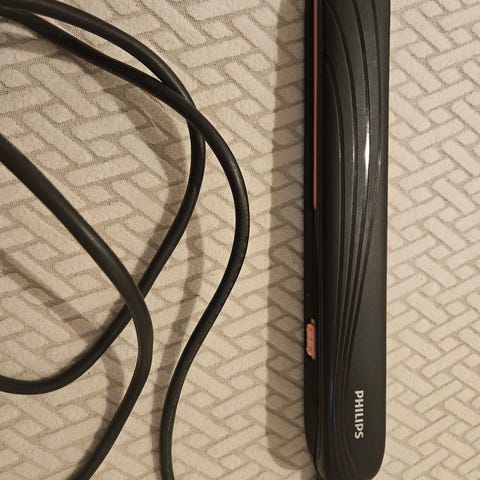 Selger en Phillips rettetang, den er pent brukt. Følger med hårruller. To av hårrullene er brukt, de to største rullene.