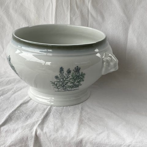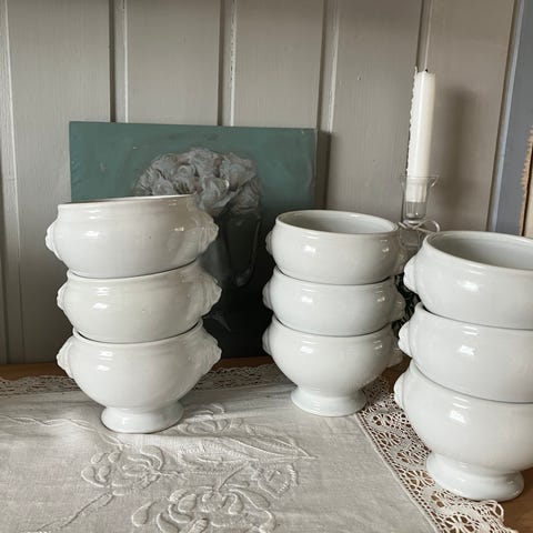 6 suppeskåler( eller kanskje blomsterpotter?). Hvite med blå stripe og løvehode . Alt porselen kan trygt benyttes i ovn opp til 300 grader, men det må gis en jevn og langsom temperaturøkning . Hbo 249 kr.