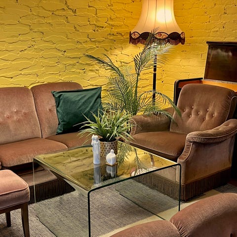 I hjørnet av sofaen på den ene puten, er det en liten kaffeflekk. Denne er lite synlig. Noen små skraper/merker kan ha oppstått på treverket. Sidebordene fremstår noe skjoldete. Treverket har jevnlig blitt behandlet med møbelpolish.