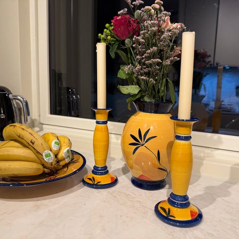 Ett sett bestående av ett ovalt fat, og to lysestaker med ulik høyde. Alt er helt og fint, med unntak av den høyeste lysestaken som er limt. Se siste bilde.