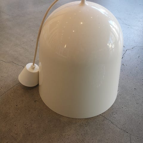 Del av serien Flos Ray, her som taklampe/pendel. Utformet i forkrommet metall. Skjerm er hvitlakkert på innsiden og høyglans sort på utsiden. Ingen skader eller merker.