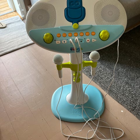 Jentene har ryddet i boden og selger unna ting som ikke blir brukt lengre. Selger her en karaokemaskin vi ikke finner laderen til, selges derfor billig. Kan til info benytte batterier.