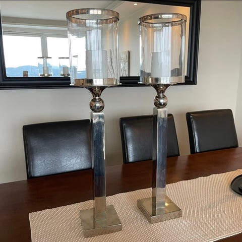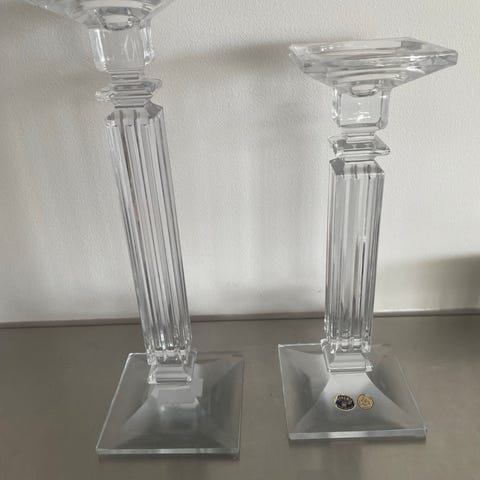 To krystall lysestaker fra Bohemia selges samlet. 730.- evt. 350 for den minste og 450 for den største. De har Ingen synlige skader. Hver lysestake veier over 2 kg og er 30 og 25 cm høye.
