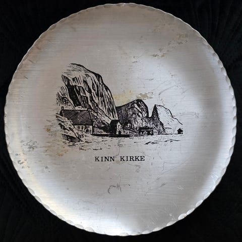 Lite Kristiansundsk dekorasjons- eller serveringsfat, med kirka, eloksert!