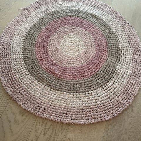 Teppe. Rundt håndheklet av tøyremser. Ø- 77cm.