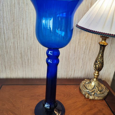 Vintage lysestaker og blomster vase i kobolt blått glass. 190 kr