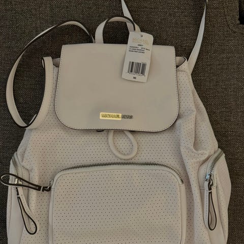Pent brukt Michael Kors veske selges, da den sjeldent blir brukt lenger. Vesken har noen få bruksmerker, men er i veldig god stand. Vesken er lys beige/ hvit med gulldetaljer. Vesken består av to rom som deles med et rom med glidelås. Vesken kan brukes både som håndveske og skulderveske da det er en fast skulderrem.