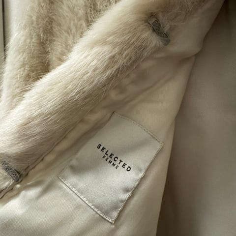Nydelig fuskepels jakke i hvit farge fra Americandreams.❤️Jakken har kort lengde og en behagelig oversized passform. Medium størrelse. Den har lommer i sidene og lukkes med knapper i front. Kjøpt for 2 år siden i Sandvika på LittSnob - butikken. Veldig pent brukt❤️.