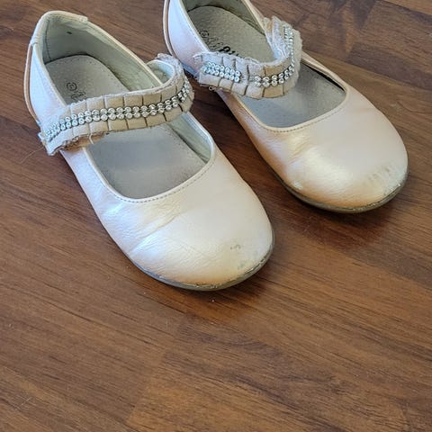 Litt slitt på tuppen foran på en sko. Kun kosmetisk i overflaten, det er ikke hull.