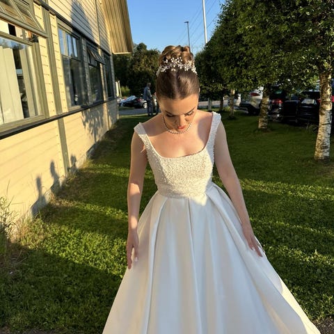 Jeg bruker størrelse S og er 164cm høy, og brukte høye hæler med plattform. Kjolen er veldig forsiktig og pent brukt. Den er kun brukt en gang 07.09.24, i pent vær og inne i lokalet (har ikke vært noe dansing/drikking og slikt i eller rundt denne kjolen).