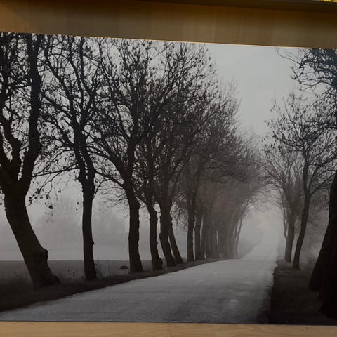Aldri blitt hengt opp, da rammen ble for stor for plakaten den var tiltenkt for. Har fått to små merker på baksiden av passepartouten, men dette er ikke synlig.