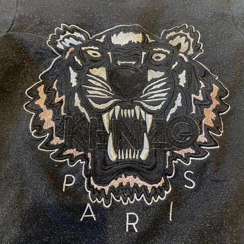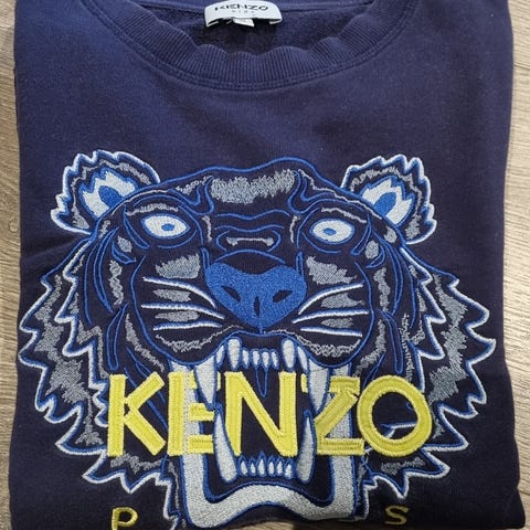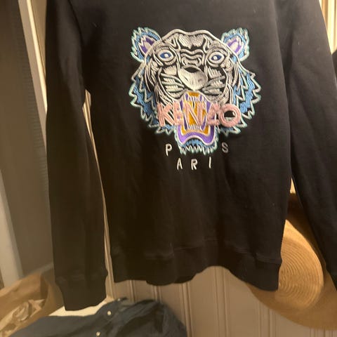Selger pent brukt bomullsgenser fra Kenzo, str 10 år. Ingen merker eller slitasjer utover normal bruk. Blå og hvit stripete med grønne detaljer.