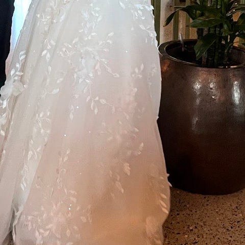Kjolen er ikkje heilt kvit, for å få få fram dei nydelige blonde mønsterene nederst rundt heile kjolen.