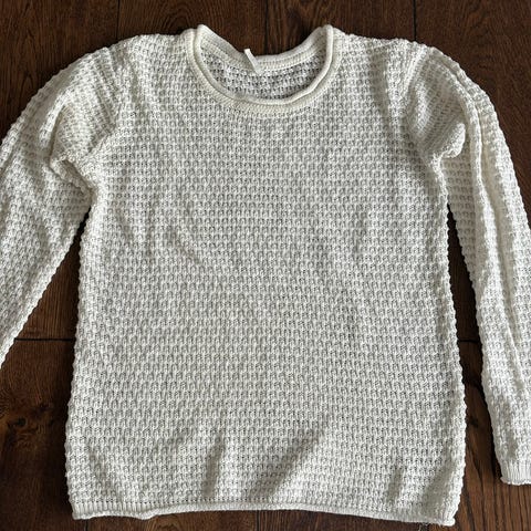 Løstsittende med vid halsutringning. Strikket i middels tykt garn i hullmønster, kremfarget med gullfargede tråder i hullene. Vaskelapp mangler men sannsynligvis akryl eller akrylblanding.
