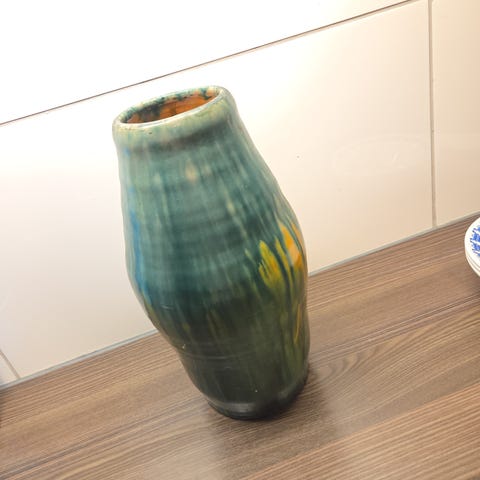 Fin glassert keramikk vase. 14,5 cm høy Ø 11 cm. Hel og fin men et par bitt nederst. Innvendig nederst er det prikker i glasuren. Se bilder.