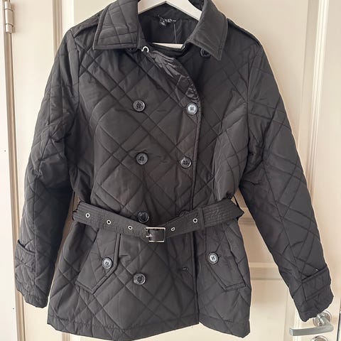 Veldig lite brukt. klassisk kåpe i kamelfarget nyanse med lange ermer og rett snitt. Den har en krage med slag og en enkelt brystlomme. Det er også to store lommer med klaffer på sidene. Kåpen har et minimalistisk design uten synlige knapper foran, noe som gir den et stramt og elegant utseende. På ermene er det dekorative knapper for ekstra detaljer.