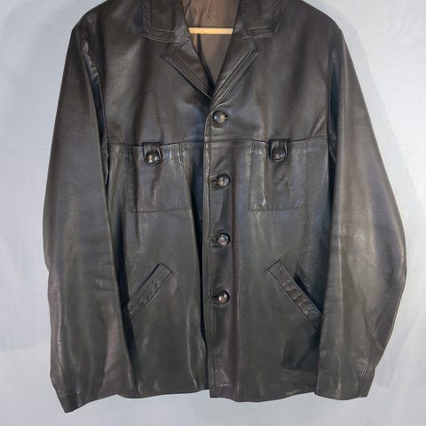 Ubrukt lærjakke fra 1960-tallet, samme type som ble brukt av politi på den tiden. Foret. Størrelse 54 = XL. 1,10 m lang kraven-bunnen. 2 lommer, 3 knapper, 2 skulderklaffer, 1 innerlomme.