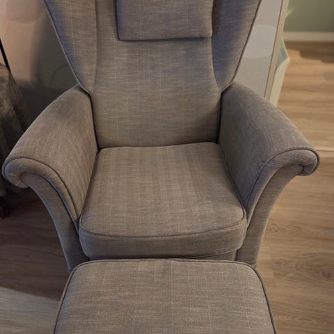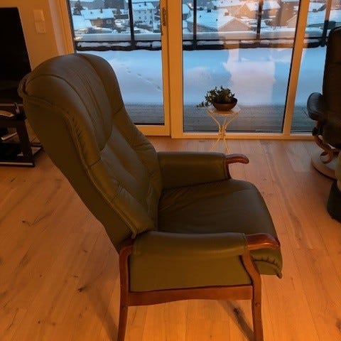 Behagelig lenestol selges rimlig. Den er 6 år ganmel men lite brukt. Ny pris på den er 18.000 kr.