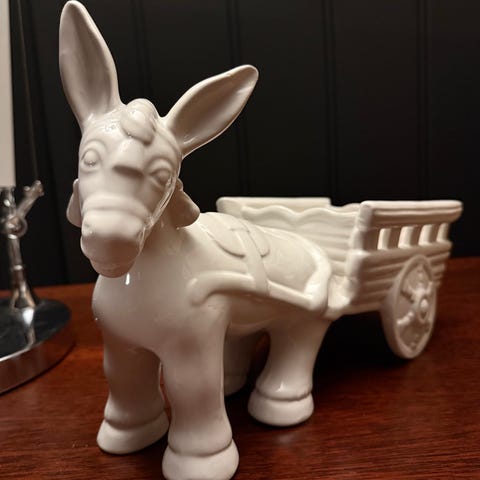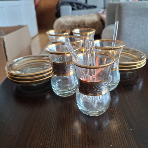 Vintage, tyrkisk te service. 6 kopper med tefat, tekanne med lokk, fløtemugge, og sukkerskål med lokk. Fasanmønster, forgylt innside og dyp blå farge. Jeg har hatt det i 30 år, aldri vært brukt. I perfekt stand. Bør hentes.