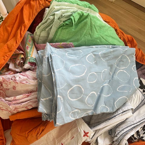 En sekk med fillete frottehåndkler og sengetøy i bomull - til veving av ryer,- eller dyrehold.