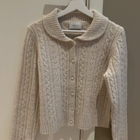 Pen hvit svært myk jakke i flettestrikk. Armhule til armhule 53 cm, hel lengde 51 cm. Helt som ny. Vasket en gang 30 grader. Feminin og søt litt kort modell. Kan sende.