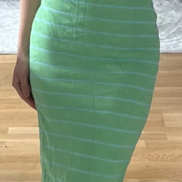 Fin grønnfarge, og strass og perler på stroppene. Ny med lappene på. Str S.