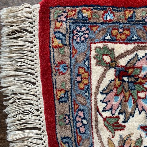 Teppet er i utrolig fin, pent brukt stand. Noen deler av frynsene er litt «frynsete», men det gjør teppet enda mer autentisk. Dette teppet har hatt et liv. Ingen hull eller slitte plasser.