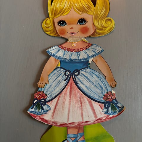Stor papirdukke, Holly Cathy, med mange flotte kjoler. Nan Pollard. Fra ca 1975