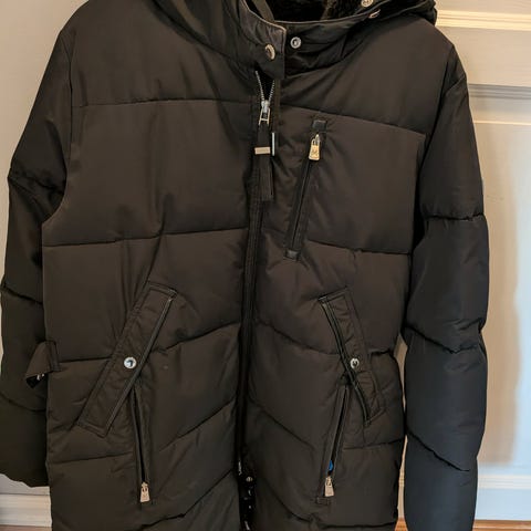 Mørk blå pent brukt, med gullfarge på glidelåser og knapper. Juksepels i krage. Hette inni kragen.