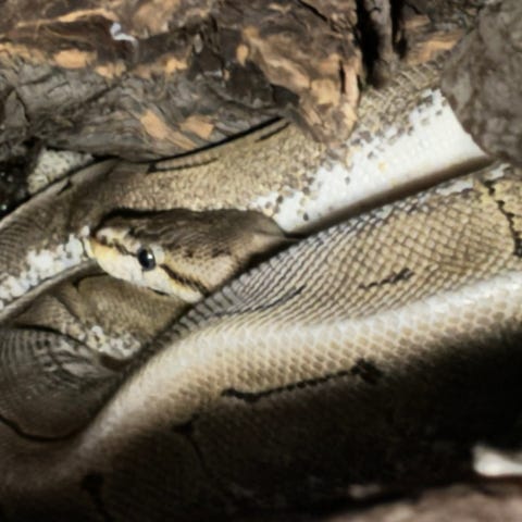 Nola (kongepyton) er i fargen desert ghost og er en jente født i 2024 på 1300 gram. Veldig søt og rolig :)