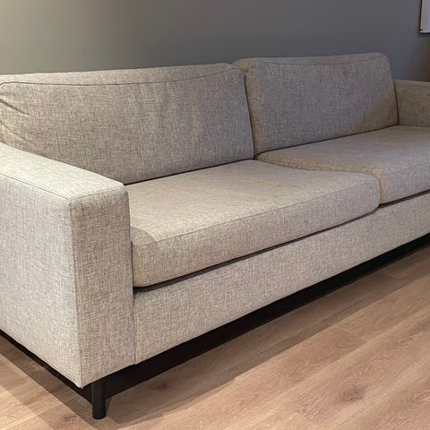 Selger en fin Scandinavia sofa med sjeselong på venstre side (sett forfra). Puff med oppbevaring under og 2 stk nakkestøtter følger også med.