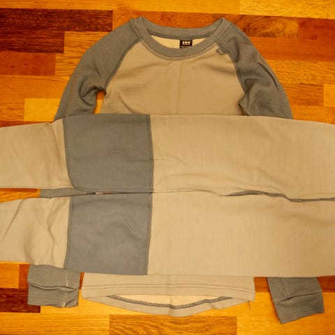 1 stk overdel hel og pen. 1 stk underdel med slitasje på knær (stoppet). Begge i 100% merinoull.
