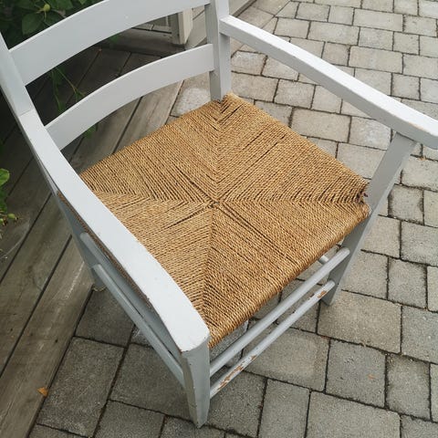 Flettetråden synes å være hel men bør flettes på nytt/strammes opp for penere sete (se f.eks. https://gjoerdetselv.com/innredning/mobler/flett-et-sete).