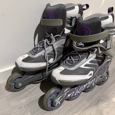 Flotte nye rulleskøyter som ikke er tatt i bruk. Kvalitet fra Rollerblade! Det følger med pent brukt beslyttelsespakke med knebeskyttere, albuebeskyttere og håndleddbrskyttere. Beskyttelsespakken er også kvalitet fra Rollerblade.