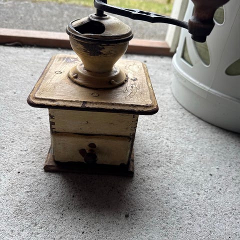 Velbygd kaffekvern med svalehale og fingertapping både på kverna og skuffen.