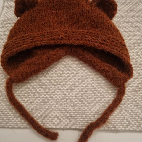babylue, blå/rød, 0-3 mndr. strikket i myk silke ull fra Nøstebarn.