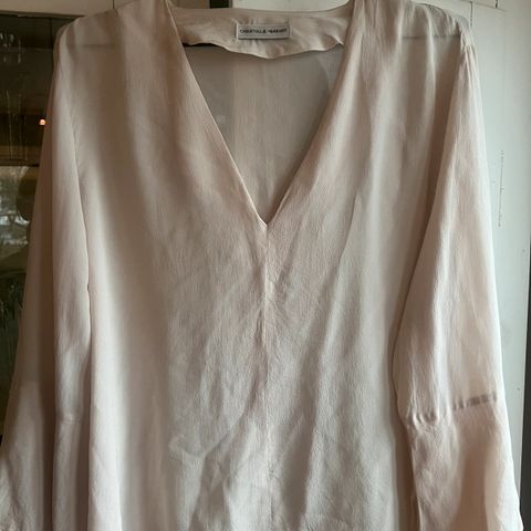 Tåkeblå, langermet silkebluse med glidlås i ryggen. Mangler stoffinfo men vet dette er 100% silke.