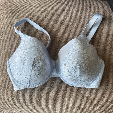 Babyblå BH fra Warners str. 36D tilsvarer 90D. Den har bøyler og formede cuper. Stroppene kan løsnes foran slik at man kan krysse stroppene bak. Ikke brukt, bare prøvd på.