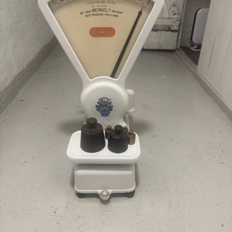 Exact kjøpmansvekt med to lodd selges. Et lodd på 2 kg og ett på 5 kg. Det er med to brett for å ha på vekta.