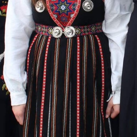 Nydelig stakk med små plisseringer bak og glatt foran. Faller meget pent når den er på. Nydelig vevd bånd nederst på utsiden av stakken , rødt bånd på innsiden. Målt fremme og med er den 98cm lang.