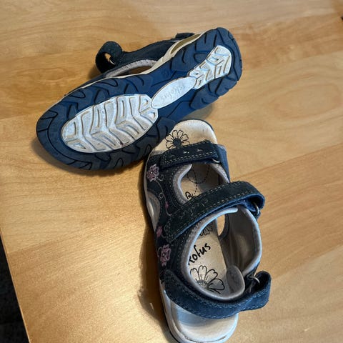 Pent brukte blå blinkesandaler fra Skooty selges. Str.32.