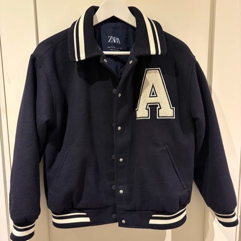 Bomber jakke med rund hals og lenge ermer.Rib kanter med bånd.Lapp på brystet med detaljer i frotté