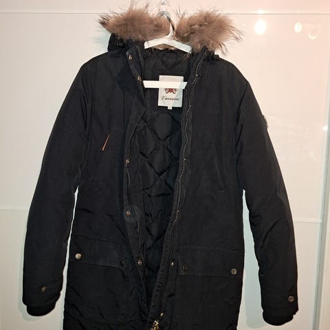 100% Polyester. Fôr: 100% Nylon. Fyll: 90% Dun 10% Fjær. Ekte pels. Renseri.