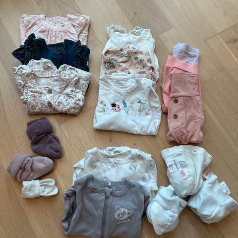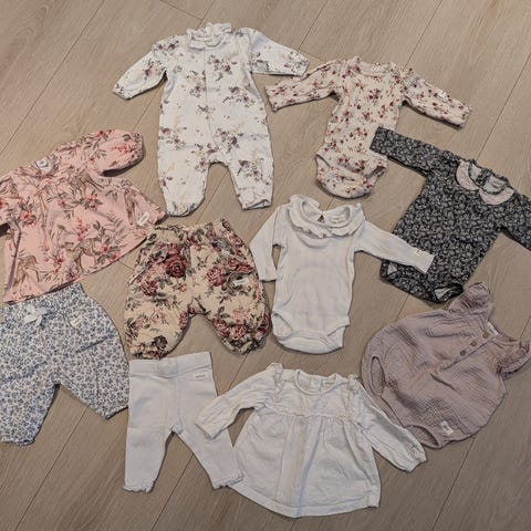 Mye hverdagsklær. Alle brukte og ser ikke ny ut, men ingen hull, inger flekker. Bodyer, pysjamas, bukser, heldress.