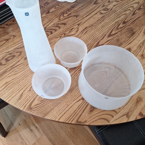 Sett fra Hadeland glassverk. 6 skåler med en stor bolle. Fin lys grønn farge, frostet glass.