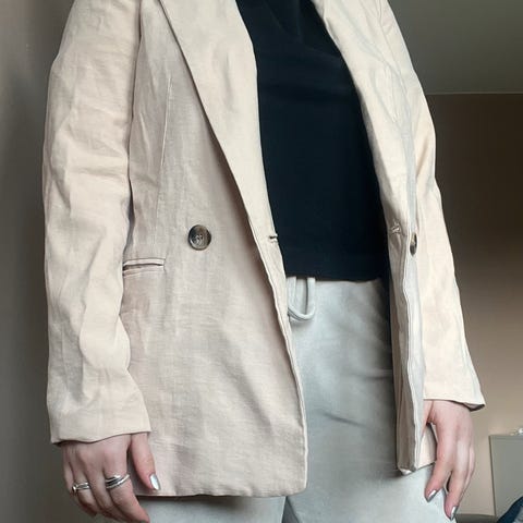 Nesten ikke brukt. Ingen feil, ingen flekker. Med for. Pyntelommer og hempe til å lukke igjen med. Elegant.