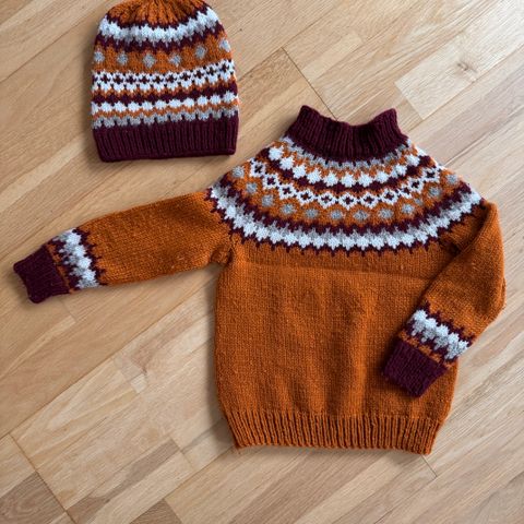 Ny håndstrikket genser og lue